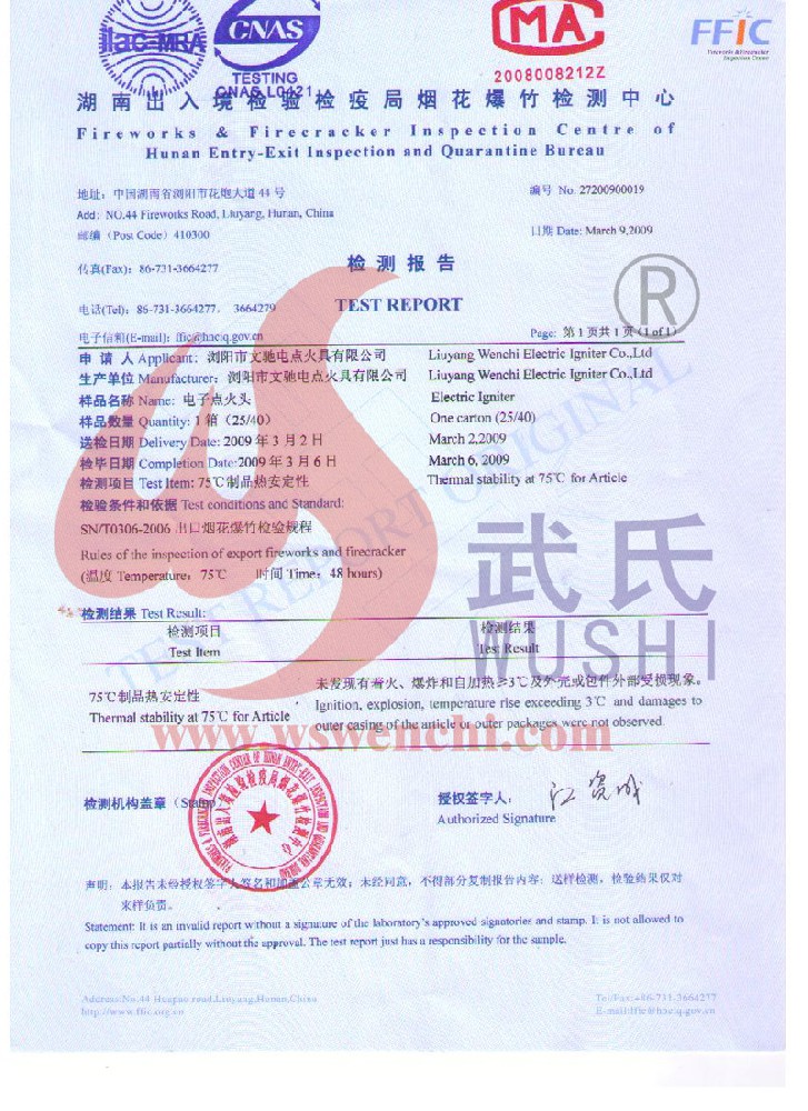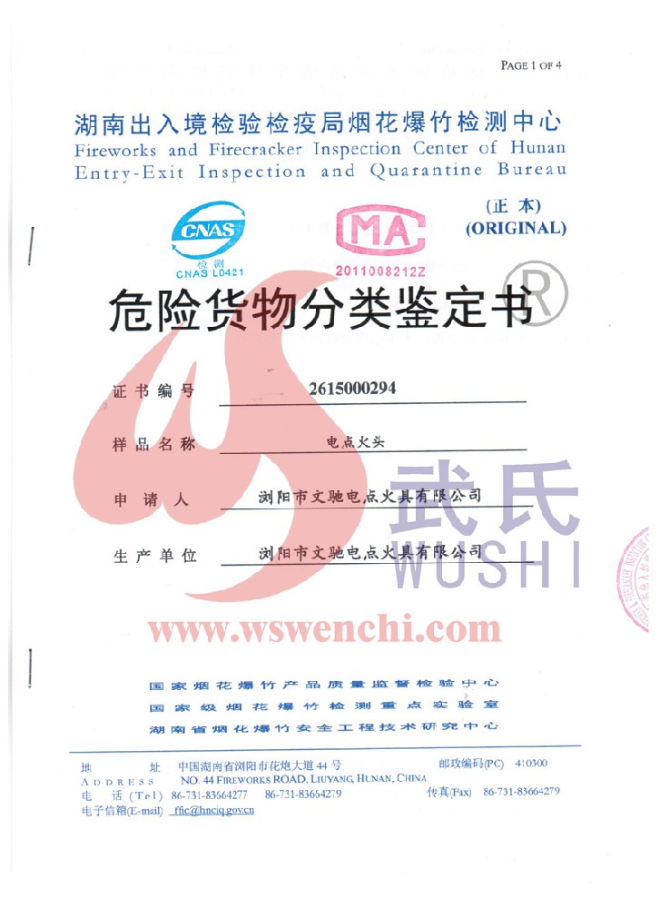 瀏陽市文馳電點火具有限公司(原培文電子點火器材廠),創(chuàng)建于1998年,是一家專業(yè)從事研制銷售電子點火產品的民營科技企業(yè),是我國第1枚煙花用電點火頭生產者,是《煙花爆竹電點火頭國標》牽頭起草單位。公司位于中國“煙花之鄉”湖南省瀏陽市,地理位置優(yōu)越,交通便利。 我公司研制的對象是用電能引燃火藥、做機械功等預定功能的一次性使用的元件或裝置,包括電點火頭(英文名ElectricMatch or Electric Igniter,中文俗稱“電火柴”或“電發(fā)火頭”)、電點火管和延期電點火管;我們估且在以后的產品技術欄中將我們研究的產品統稱為電點火具,將電點火器看成是用于提供和控制供給電點火元件點火的電能器材;我們研究的電點火橋路有橋絲式、無橋絲···